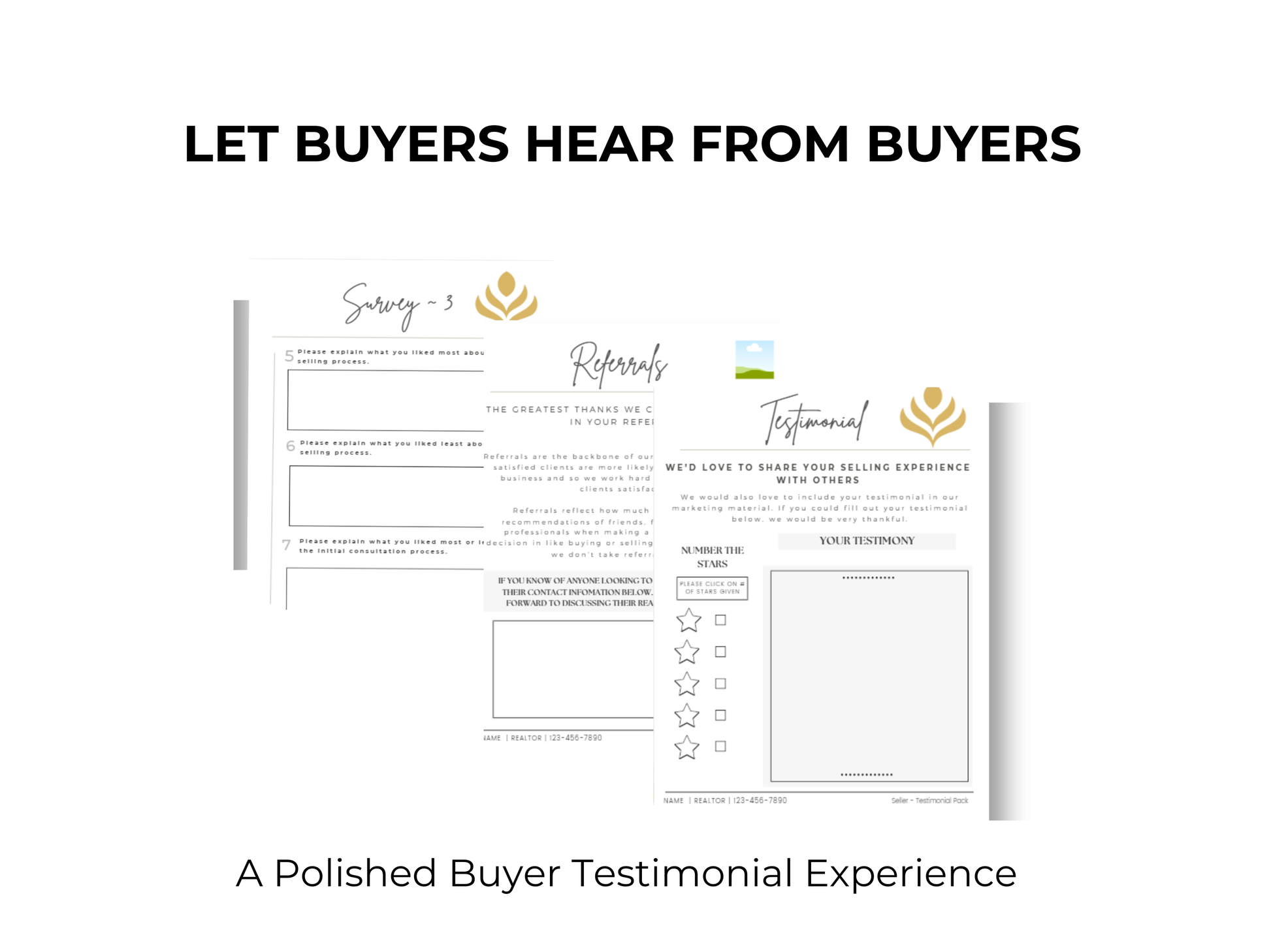 This pack allows you to present buyer testimonials intentionally, so prospective buyers feel confident choosing you before the first consultation.