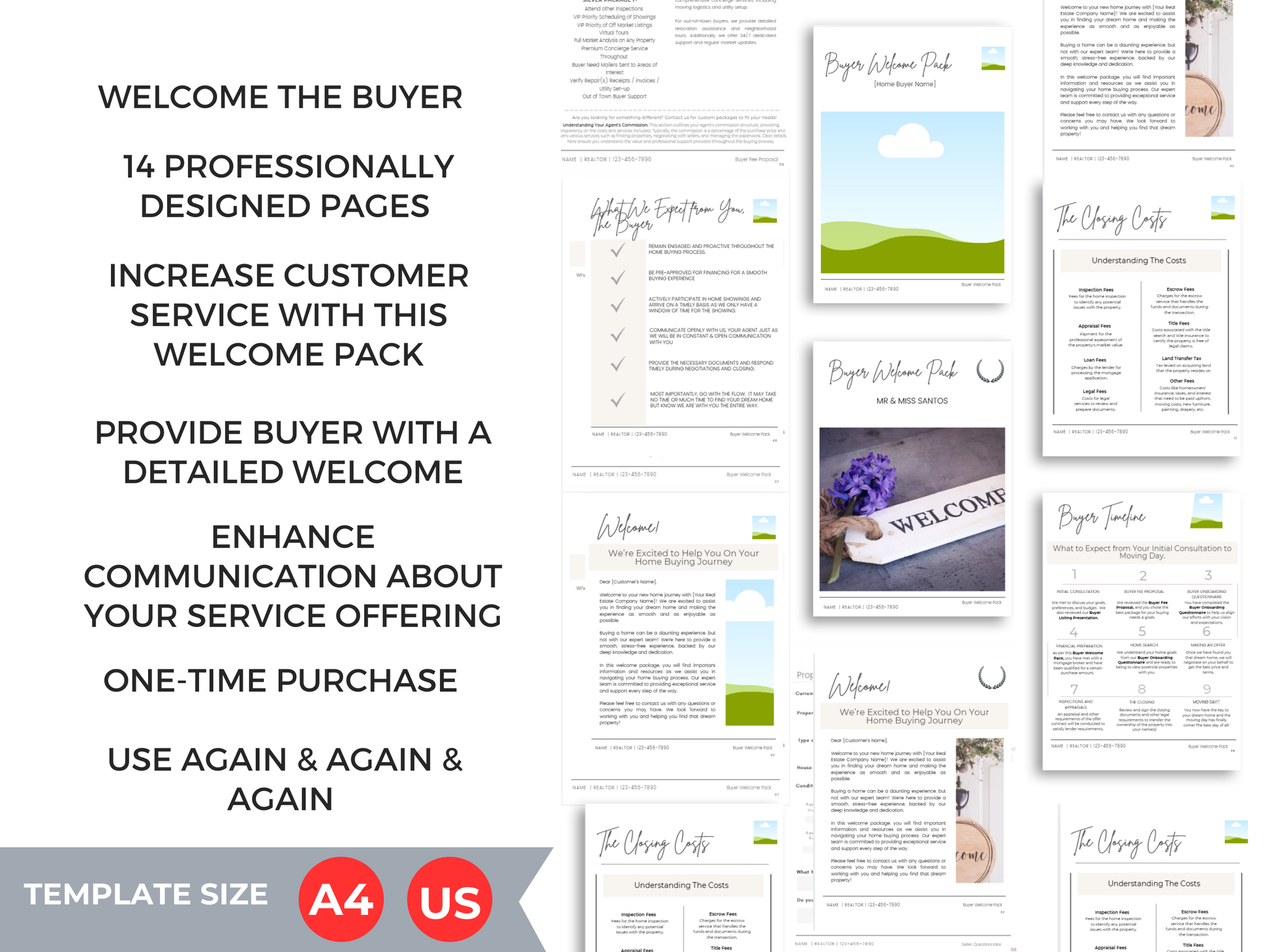 Our Buyer Welcome Pack Template is designed to provide your buyer client with essential information and tools to make the home buying experience as smooth and enjoyable as possible. Buying a home is a significant milestone, and it is important to have the right support and information at your fingertips via the Buyer Welcome Pack Template.