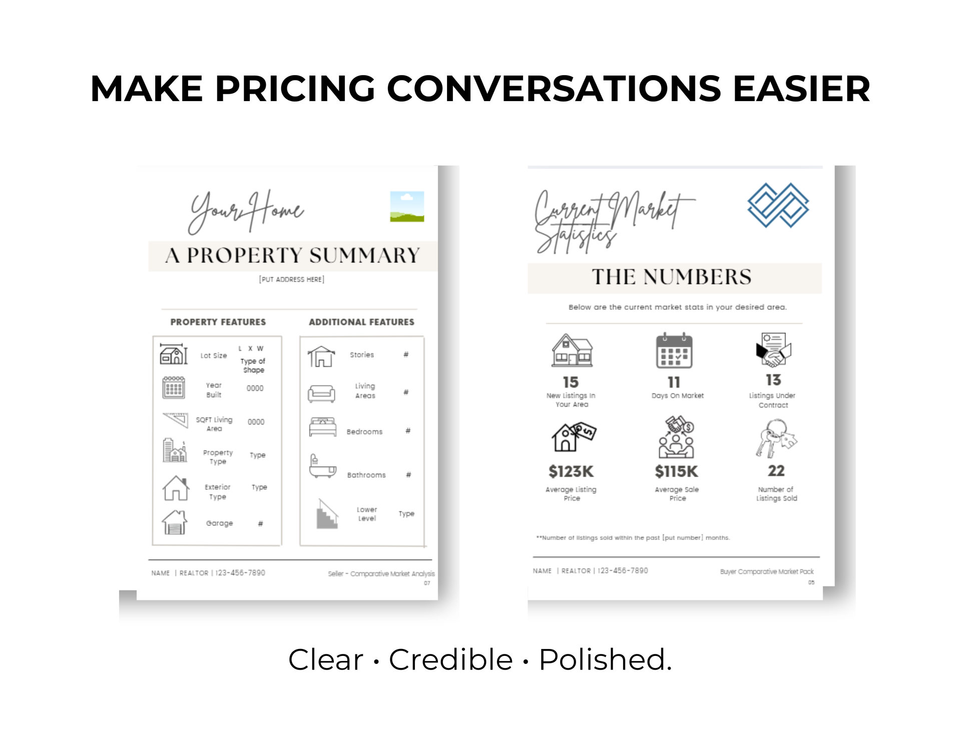 Instead of overwhelming sellers with raw data or disconnected charts, this CMA Pack helps you tell a clear pricing story — one that makes your recommendation easy to understand and easy to accept.