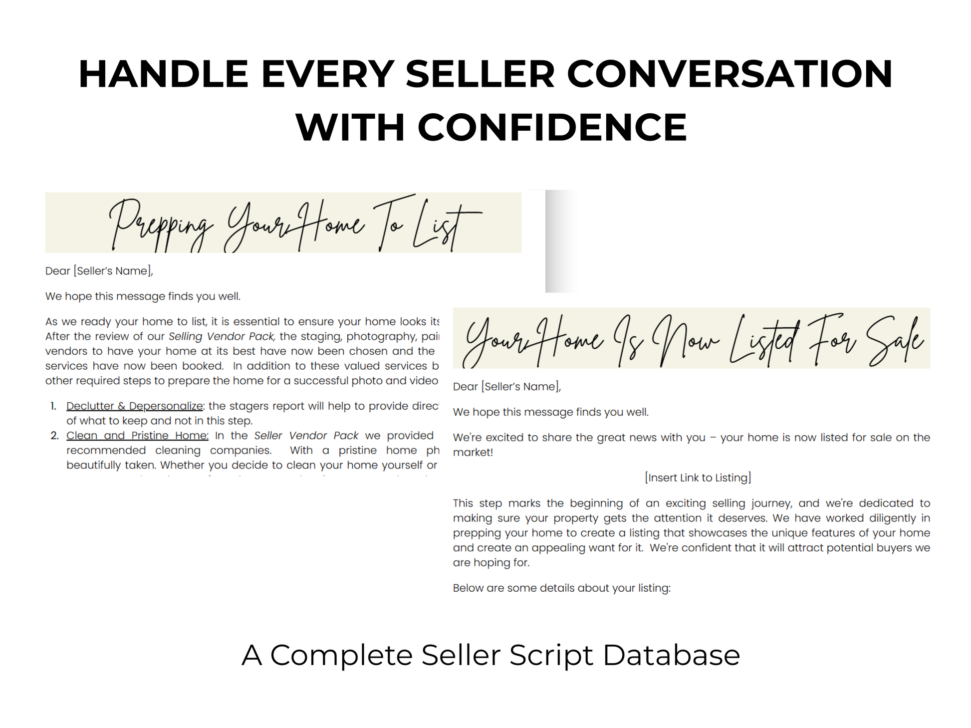 A database of 21 professionally written, fully editable Seller Email Script Database that includes pre-written emails for key moments such as: